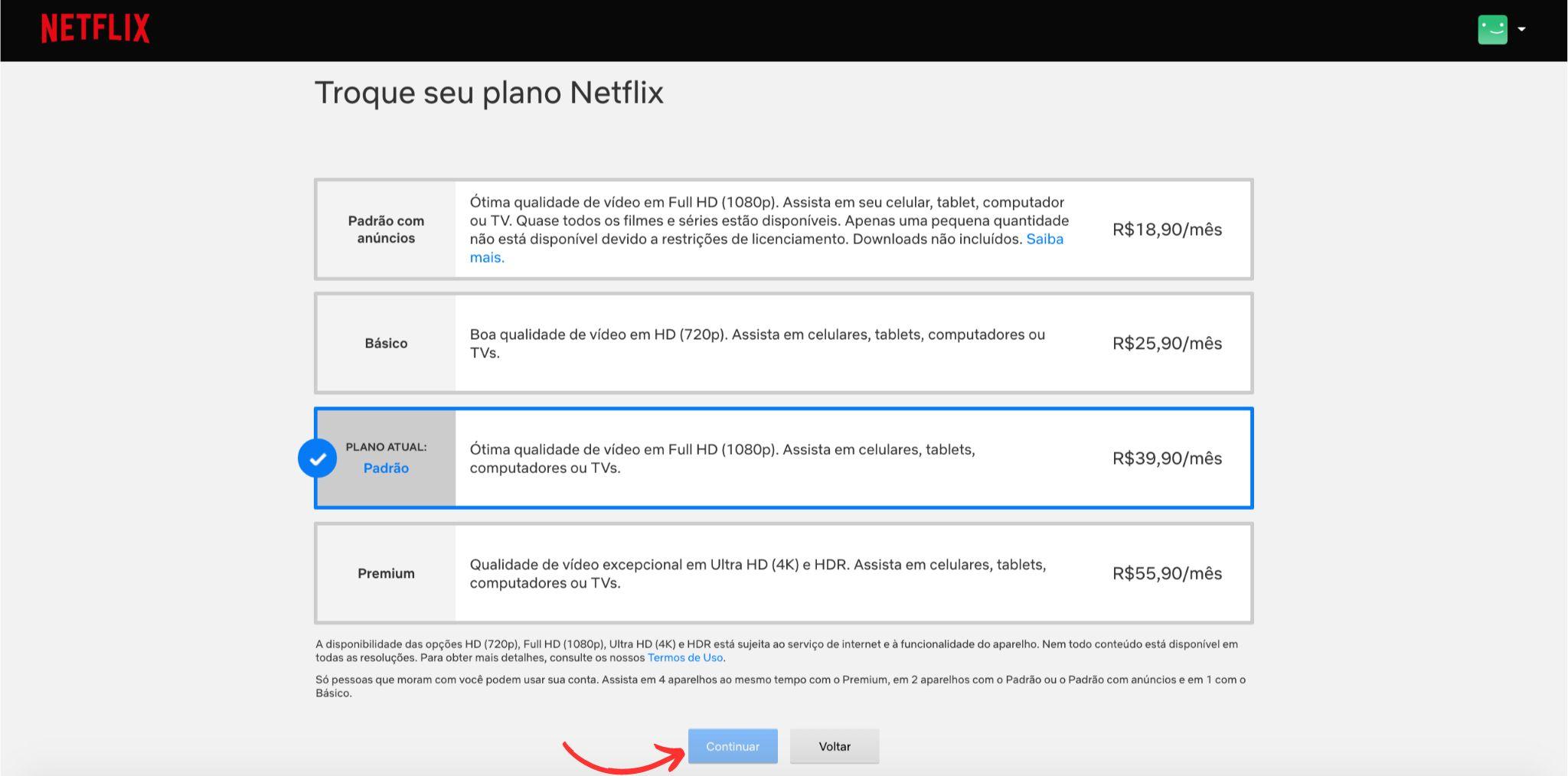 Este é o momento para você definir se precisa de acesso para uma ou para simultâneas telas, qual qualidade de reprodução deseja, em HD ou em Ultra HD (4K), ou se apenas um plano básico, com ou sem anúncios, atende à sua demanda.