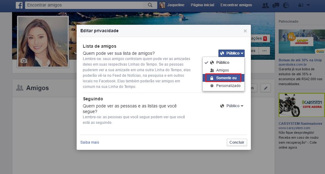 Aí poderá ver quem pode ver a sua lista de amigos do Facebook, se quiser que mais ninguém e apenas você possa acessar a esta informação, selecione "Somente eu" ou personalize como mais gostar.