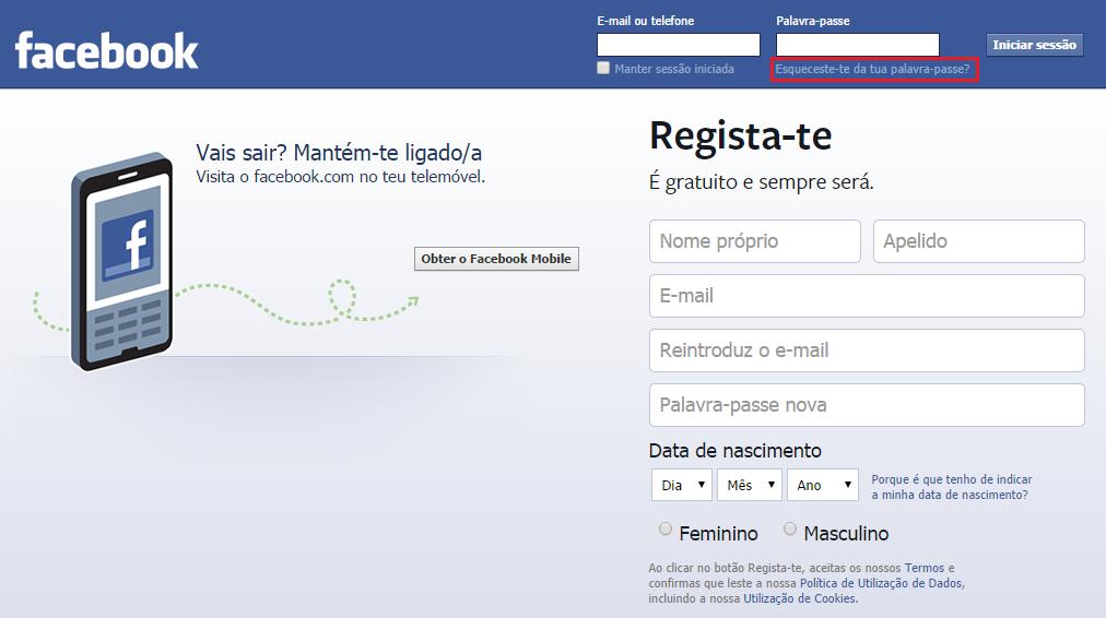 Primeiro para recuperar sua senha do Facebook acesse o site desta rede social. Abaixo do campo para colocar a senha, localizado na página principal, acesse o link que diz "Esqueceste-te da tua palavra-passe?", marcado a vermelho nesta imagem. Clique para continuar com o processo.