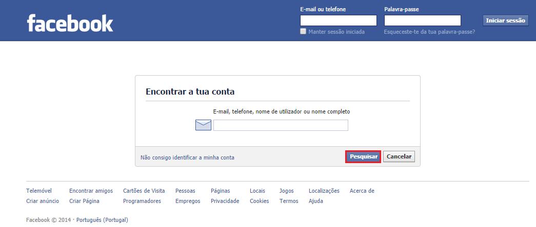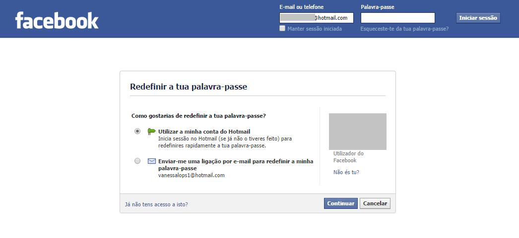 No passo seguinte deverá entrar, tal como mostra na imagem, com o endereço de e-mail com o qual se cadastrou no Facebook. Se você esqueceu também o e-mail cadastrado, você tem a opção de escrever um número de telefone, caso o tenha fornecido ao Facebook quando preencheu seu perfil, seu nome de usuário ou o nome completo com o qual se cadastrou.