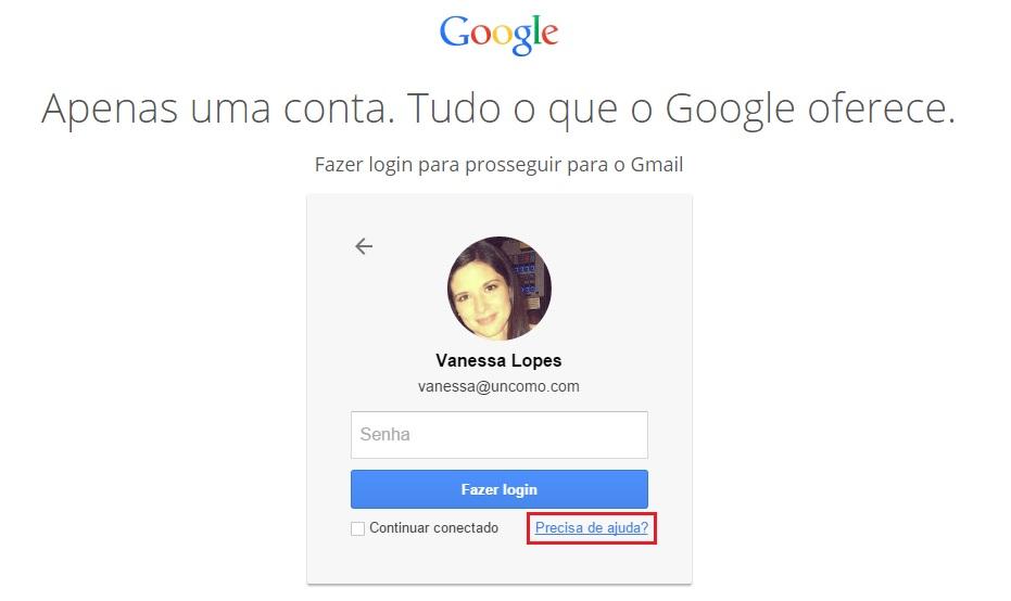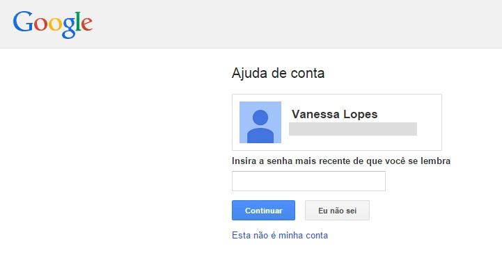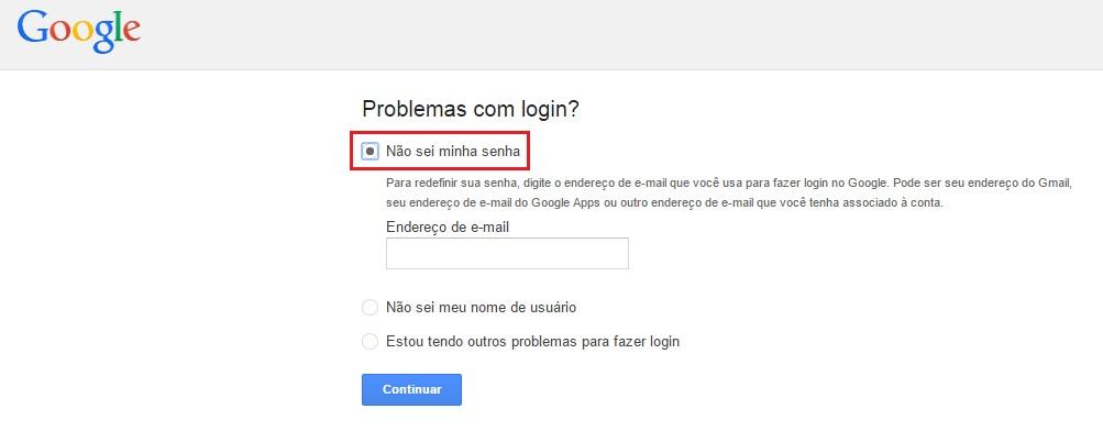 Ao entrar neste link o Gmail oferece-lhe várias alternativas: escolha a primeira, "Não sei minha senha". No quadro você tem que adicionar o endereço do Gmail que usa, cuja senha não se lembra, e depois clicar em continuar.
