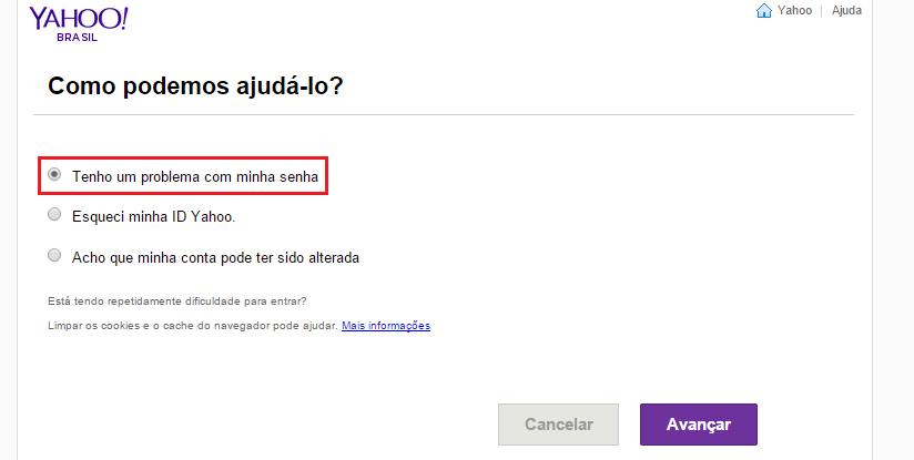 O Yahoo perguntará a você a respeito do problema que quer resolver, você deverá indicar a primeira opção "Tenho um problema com minha senha".