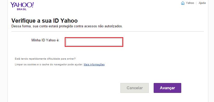 Insira seu ID ou e-mail do Yahoo para continuar com o processo de recuperação da senha e clique no botão "Avançar".