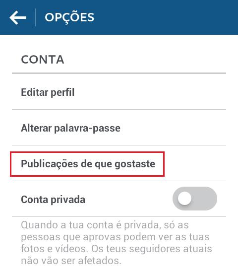 Uma vez que esteja na página do seu perfil, deverá fazer scroll para baixo até Conta e, uma vez aí deverá selecionar a opção de "Publicações de que gostaste".