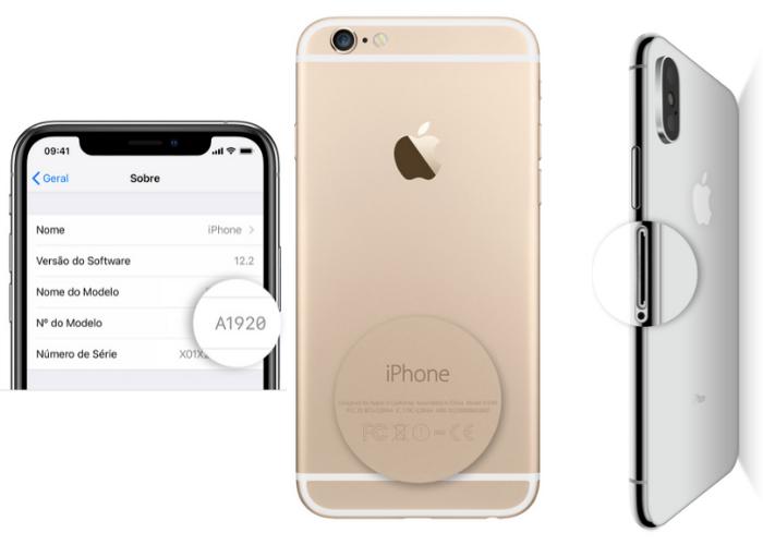 No caso do iPhone, todas as edições têm o modelo descrito na própria carcaça do celular na parte de fora. Basta retirar a capinha dela, caso haja, e ler as letrinhas que costumam ficar mais para baixo, conforme mostrado na imagem. Outra maneira simples, caso você não consiga identificar o celular por fora é abrir a bandejinha do SIM. Ali você encontrá o número do modelo 'tatuado' na bandeja.