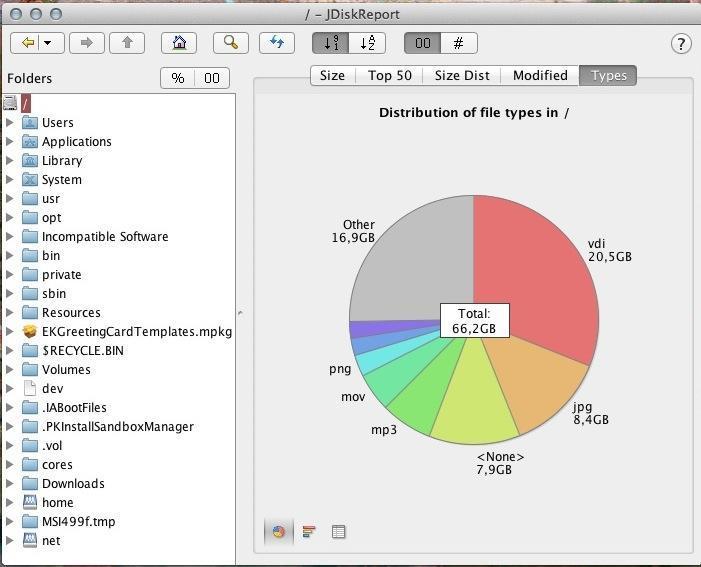 Também é interessante a opção do programa de saber quais são as pastas mais pesadas do computador em função do tipo de arquivo. Para poder obter esta informação, você deve clicar sobre a opção do menu horizontal superior que diz "Types". No nosso computador, os .vdi, discos rígidos virtuais para VirtualBox, são os mais pesados.