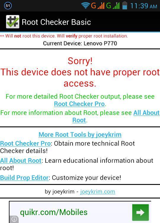 Se, pelo contrário, o smartphone não estiver rooteado, a mensagem que verá será a vermelho e dirá "Sorry! This device does not have proper root access".