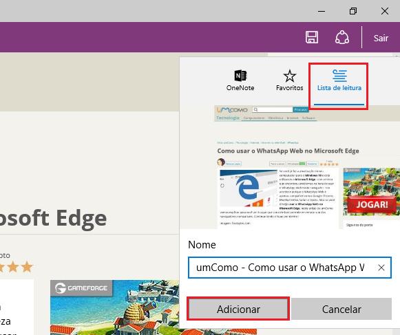 De seguida, selecione a opção "Lista de leitura" e adicione o nome da página de maneira a que se recorde mais tarde. Faça clique no botão Adicionar e já tem essa página guardada para conseguir ler offline no Microsoft Edge.