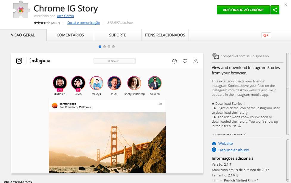 - No Google Chrome, busque pela extensão Chrome IG Story e instale no seu navegador;