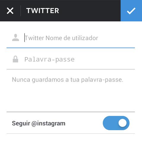 Agora introduza o seu nome de usuário do Twitter, a sua senha e clique sobre o botão azul com o check da parte superior direita para confirmar os dados.