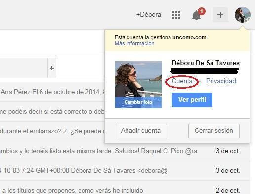 Para começar o processo de troca de senha do Gmail você deverá entrar em sua conta e ir à parte superior direita, onde se encontra sua fotografia. Clique na fotografia e você verá duas opções: "conta" e "privacidade". Selecione conta.