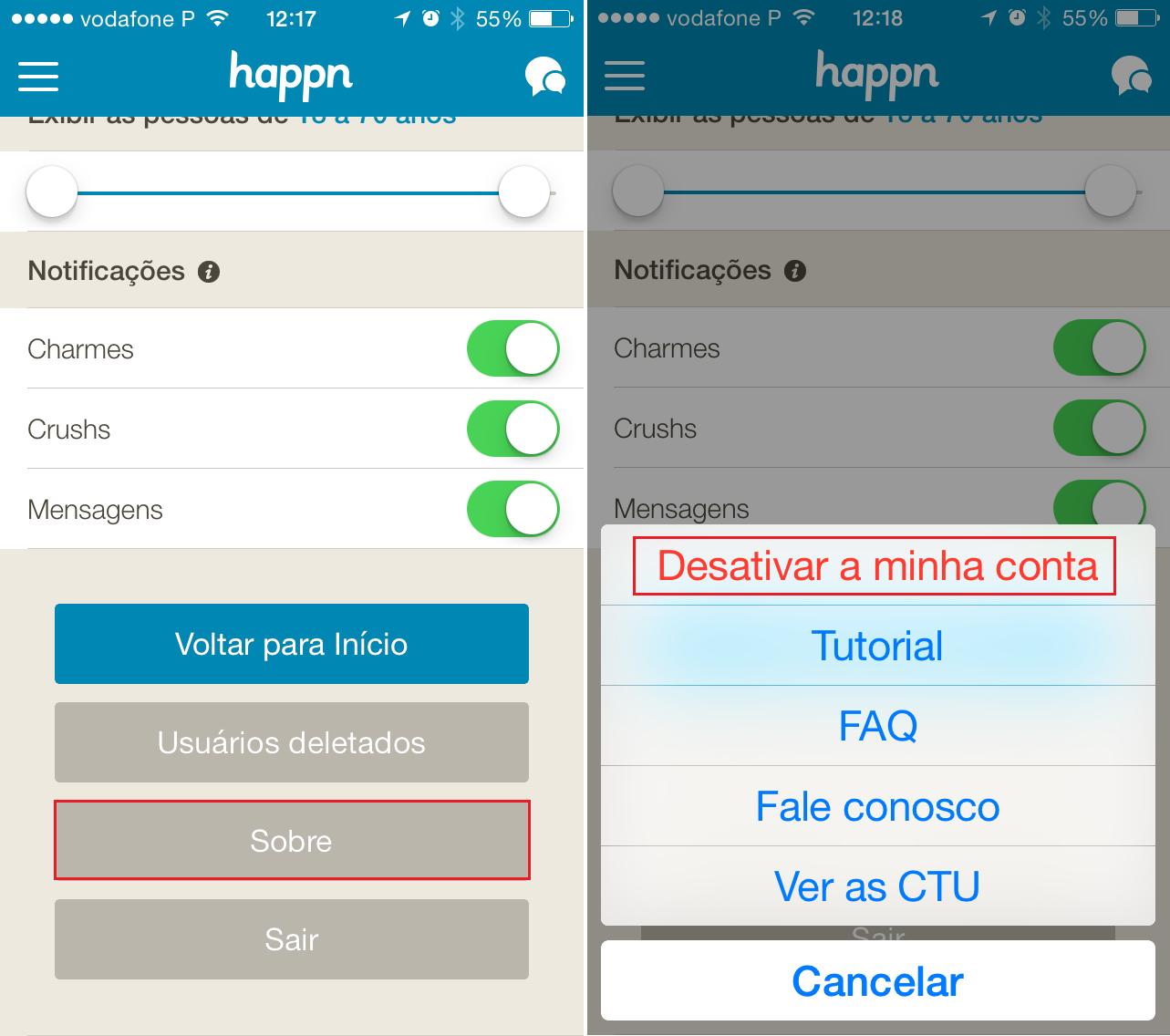 E se entretanto encontrar a sua alma gêmea no Happn ou não, poderá desativar a sua conta no app facilmente. Basta acessar a Preferências e, no fundo da tela clicar em "Sobre". Depois clique em "Desativar a minha conta" e confirme.