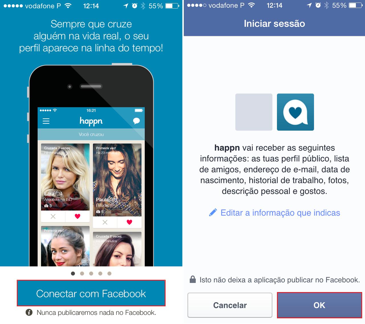 Uma vez instalado, abra o aplicativo. Para usar o Happn você terá de conectar o app com o seu Facebook, clicando em "Conectar com Facebook". O Happn só dá a opção de cadastro através do Facebook para evitar a criação de perfis falsos. De seguida, deverá autorizar o app a aceder à sua informação do Facebook, clicando em "Ok".