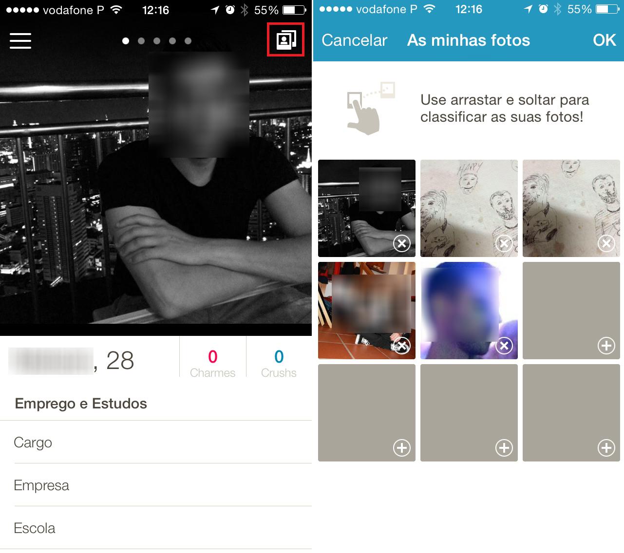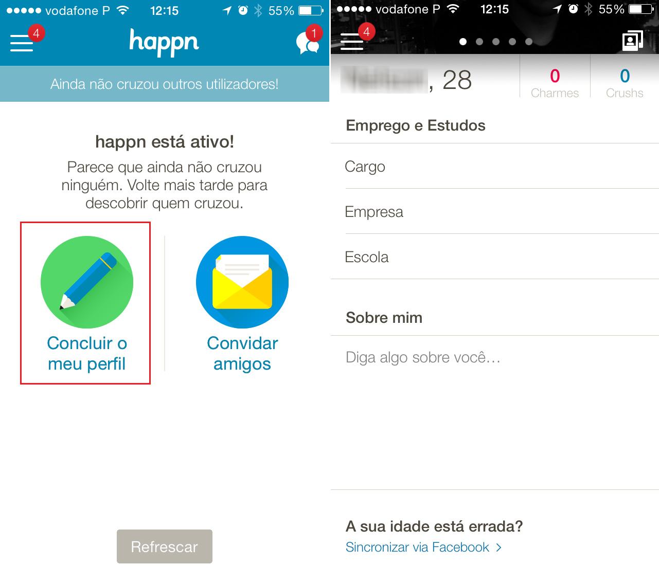 O Happn também lhe permite alterar a foto de perfil ou adicionar mais fotos ao seu perfil. Para isso, vá até ao seu perfil e clique no ícone do canto superior direito. O app adiciona automaticamente mais cinco fotos suas do seu perfil do Facebook. Se desejar poderá eliminá-las ou adicionar mais fotos.