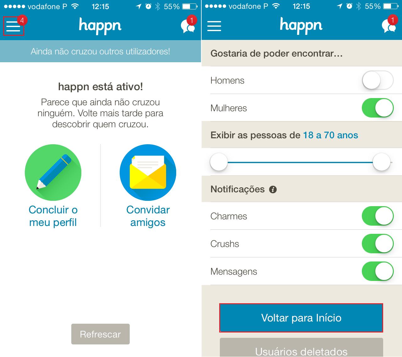 De seguida, deverá configurar as suas Preferências. Para isso, clique no ícone dos três traços horizontais no canto superior esquerdo e vá a "Preferências". Aqui poderá ajustar configurações como o sexo desejado, a idade e se deseja receber notificações. Depois das alterações feitas clique em "Voltar para início".
