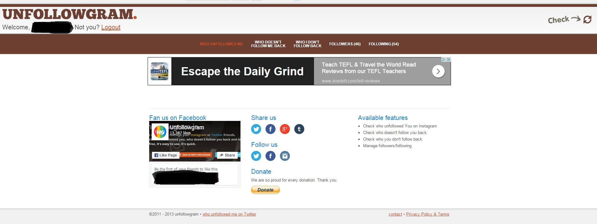 Depois de realizar estes passos, irá então entrar na página de seu perfil em unfollowgram.