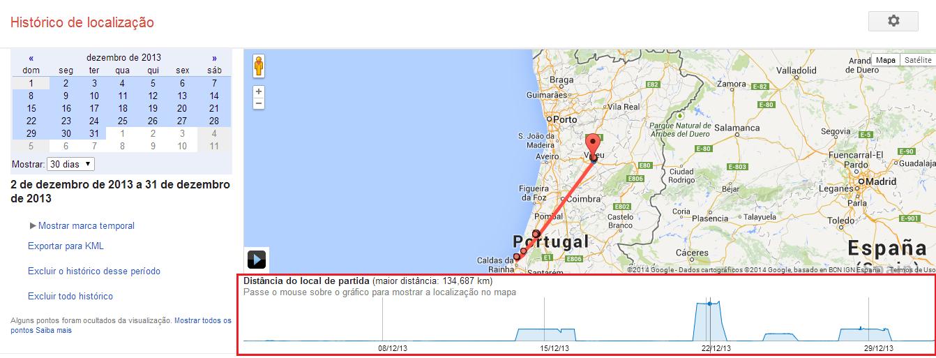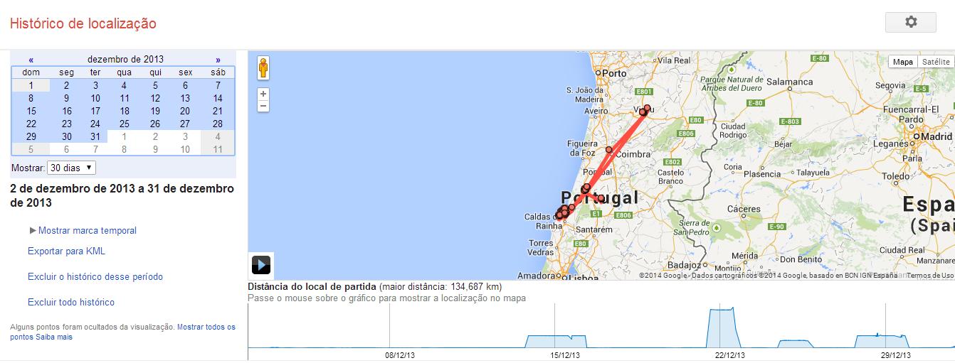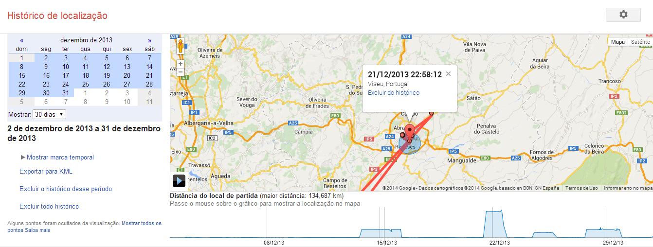 Depois de escolher as datas pretendidas, você poderá ver no mapa todos os pontos de referência assinalados. Se você clicar em ponto vermelho, conseguirá ver mais detalhes como data, horário e a sua posição no mapa. Em algumas situações pode dizer se você esteve parado em algum ponto específico.