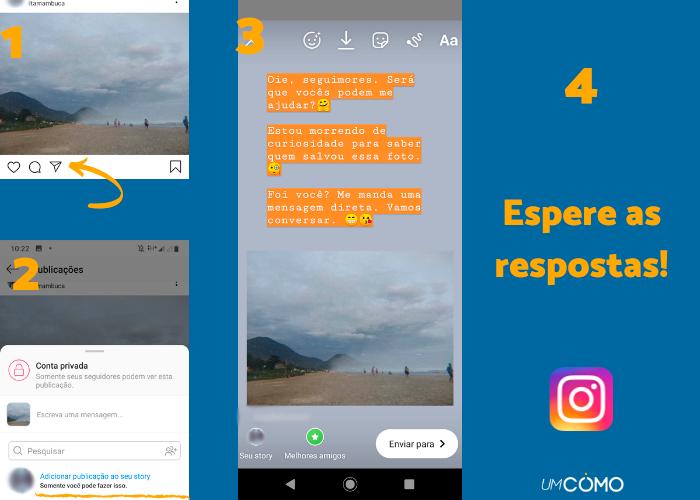 - Pergunte aos seguidores. Na hora de pensar na pergunta, você pode escrever algo do tipo 'Oie, seguidores. ☺ Estou morta de curiosidade para saber quem salvou essa foto. Me conta por privado, por favor? Vou amar saber. Você são demais. Obrigada!' 😘