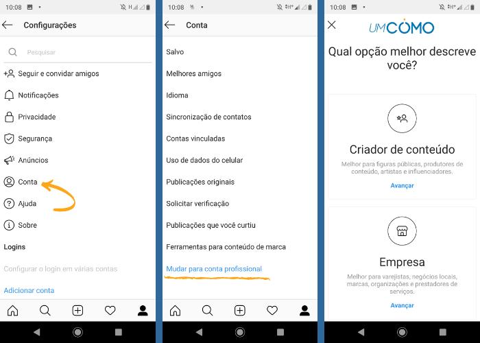 - Então, selecione a opção 'Conta' e, em seguida, 'Mudar para conta profissional';