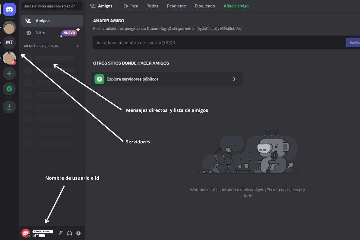 Assim que termina de carregar, o discord exibe uma tela inicial. Lá, você poderá ver sua lista de amigos na janela principal. No lado esquerdo da tela, você pode ver os servidores aos quais você se juntou. Cada usuário recebe uma tag discord exclusiva que consiste em um nome de usuário (diferencia maiúsculas de minúsculas) e também um número de identificação.
