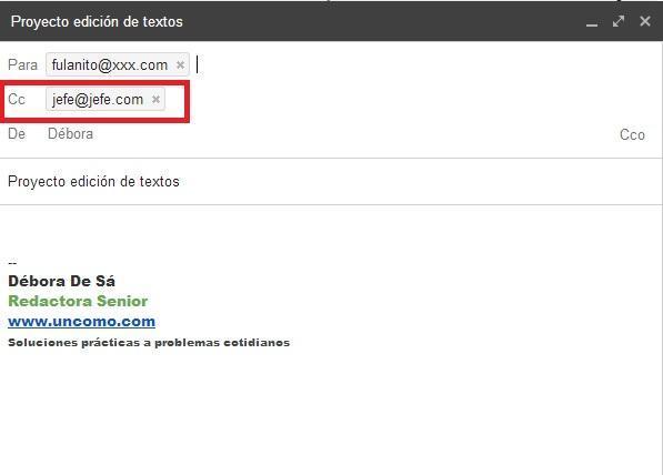Você pode usá-lo, por exemplo, quando vai transmitir uma informação a respeito de um projeto que está liderando, mas deve manter seu chefe informado, assim você escreverá o e-mail dele em CC e não em Para. Todos os destinatários desse e-mail poderão ver os endereços de e-mail que se encontram na lacuna CC.